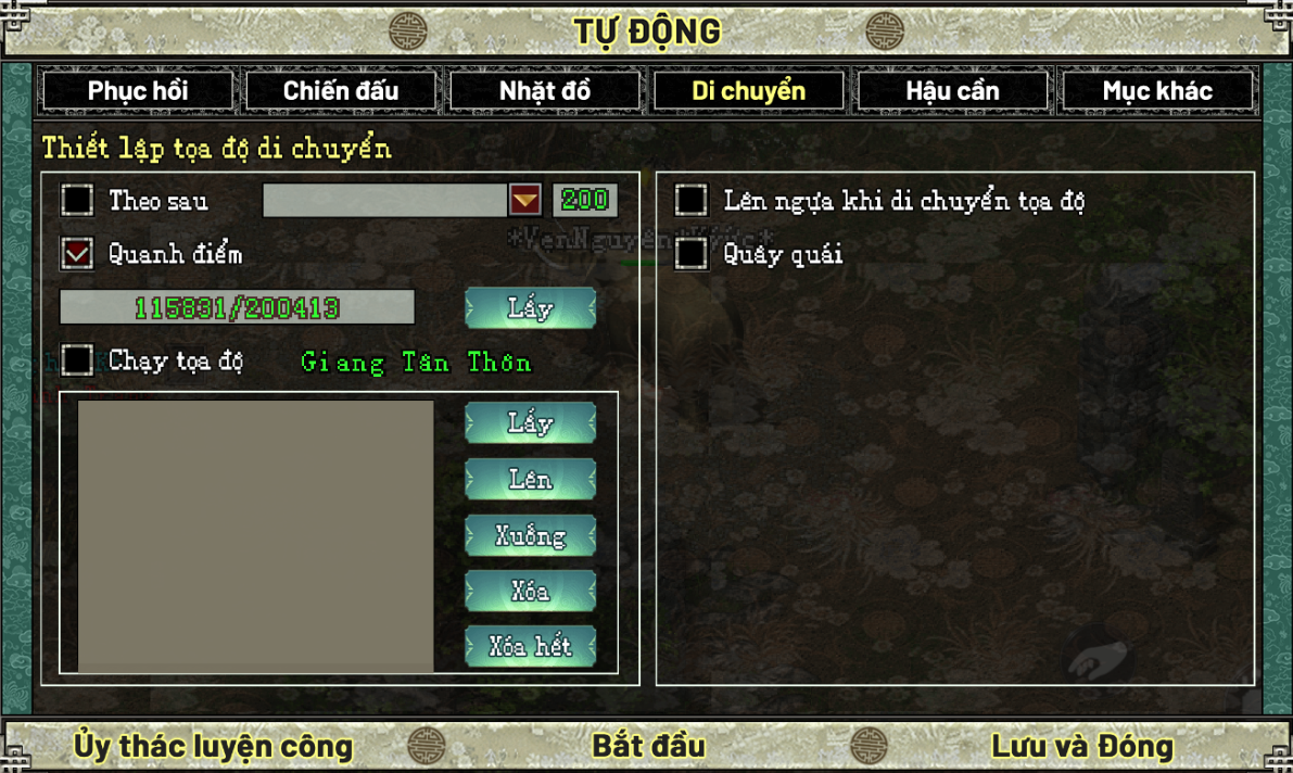 • Quay lại nơi cũ: Nếu bị chết hoặc lưu rương không đúng với map thì không thể quay lại điểm cũ, Auto sẽ tiếp tục lựa chọn các map đã lưu trong dòng “Những nơi đã đi qua”. Chọn thứ tự dòng chọn tương ứng để auto lựa chọn.