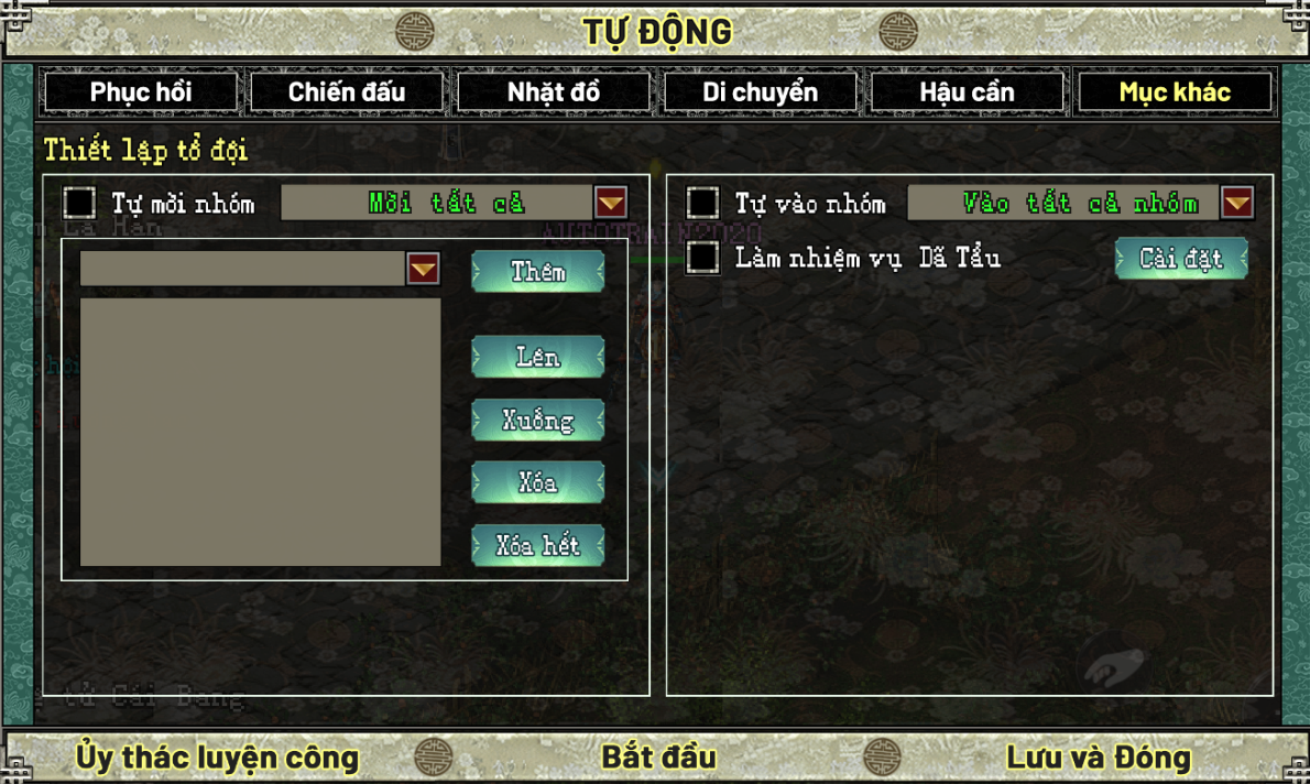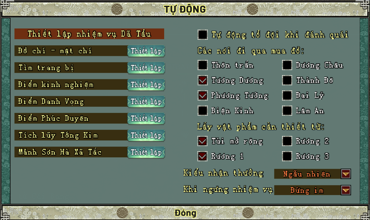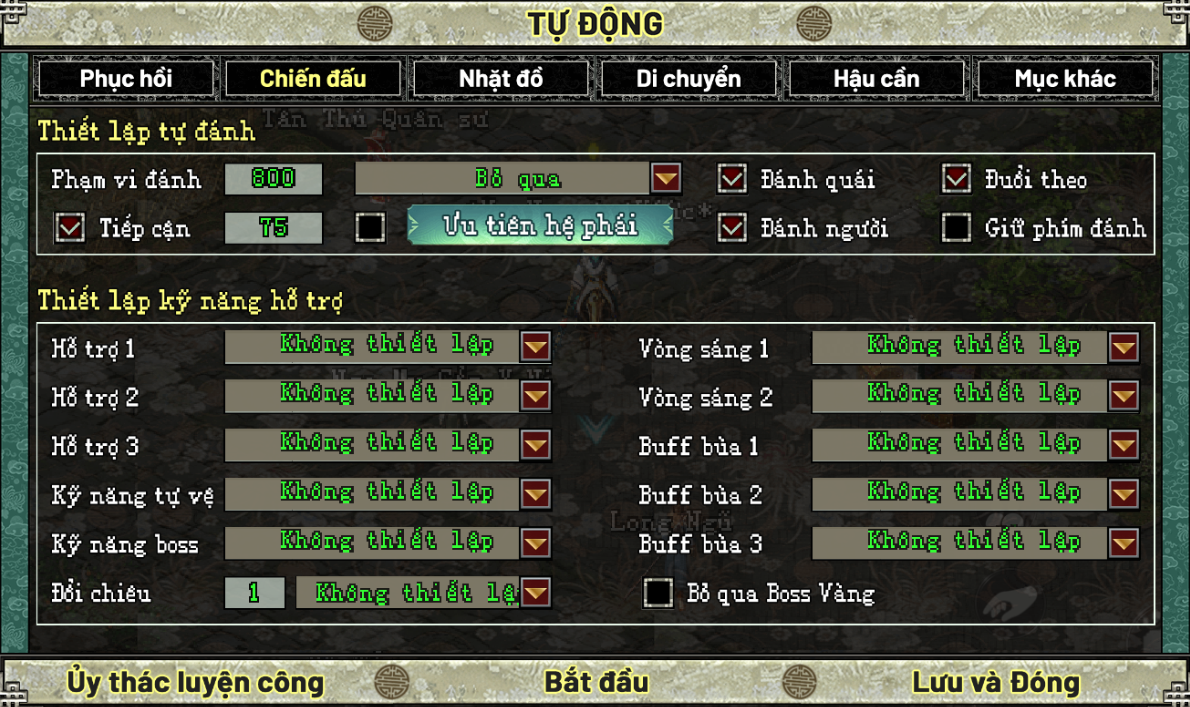 • Đánh quái và đánh người: khi bỏ tùy chọn cái nào thì sẽ không đánh loại đó nữa.