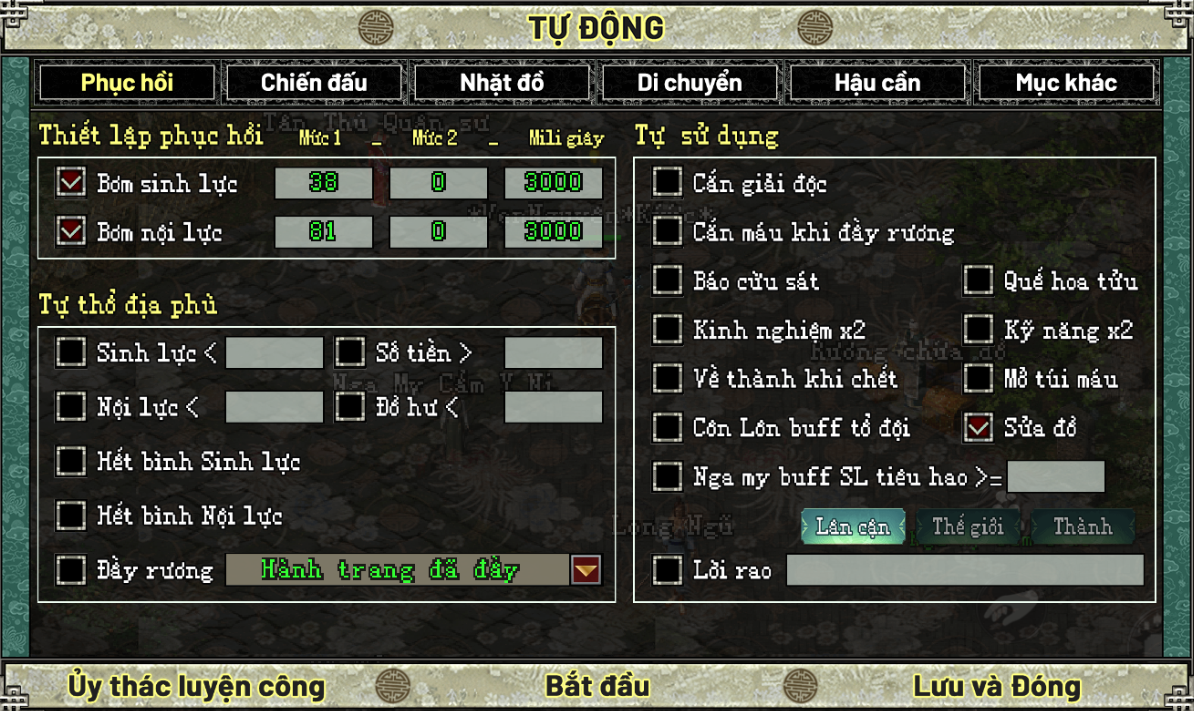 • Khi máu nhỏ hơn số đã cài thì auto sẽ phù về thành và chạy tiếp các cài đặt trong mục Hậu Cần