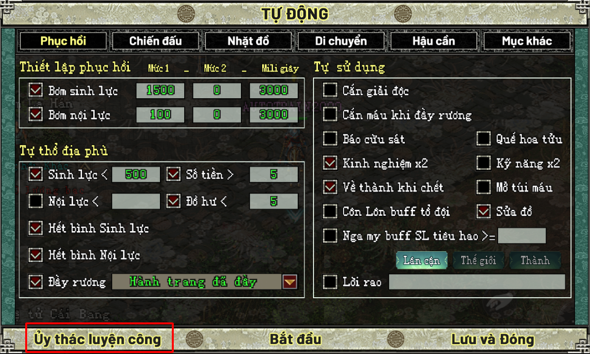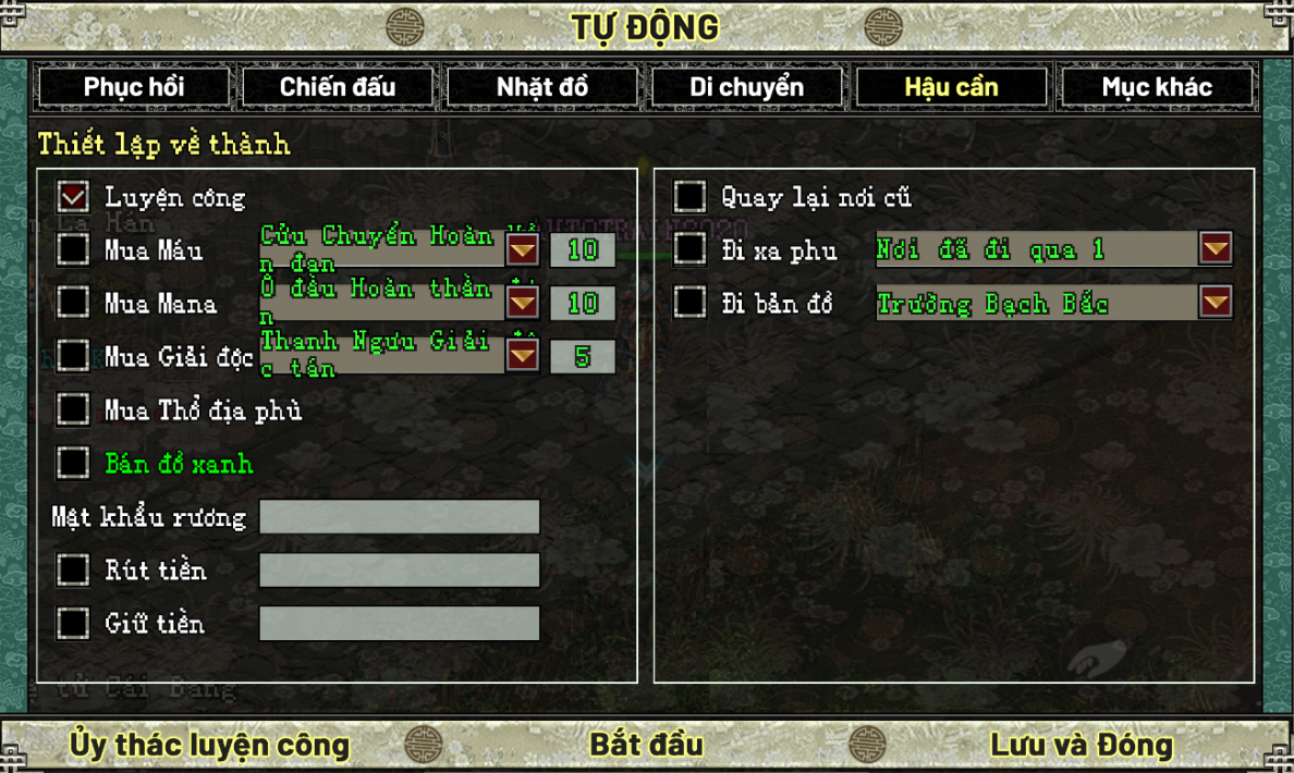 • Luyện Công: luôn luôn bật để auto sẽ làm các mục trong Hậu Cần